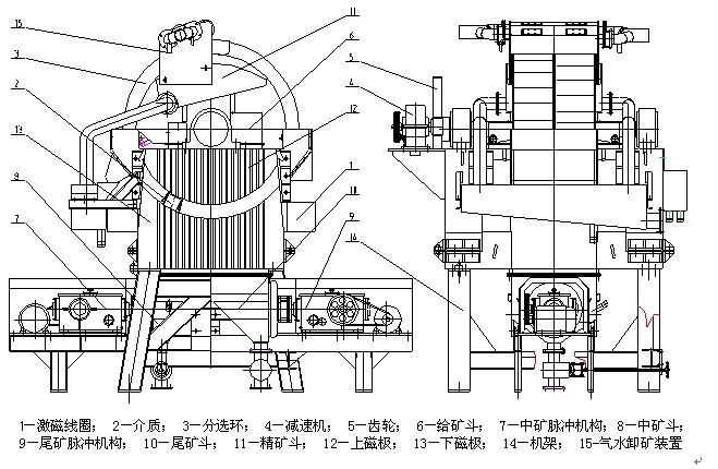 。本機(jī)廣泛應(yīng)用于選礦、洗煤、化工等部門,用于濕式選礦粒度為6-0毫米的強(qiáng)磁礦物,礦物分為磁性物和非磁性物。其選擇的強(qiáng)磁性物的比磁性系數(shù)x必須在3000×106cm3/克以上,這種礦物有磁性礦物、磁性黃鐵礦物等,必須選擇紅鐵礦物、褐鐵礦物、礦物等進(jìn)行磁性烘烤。