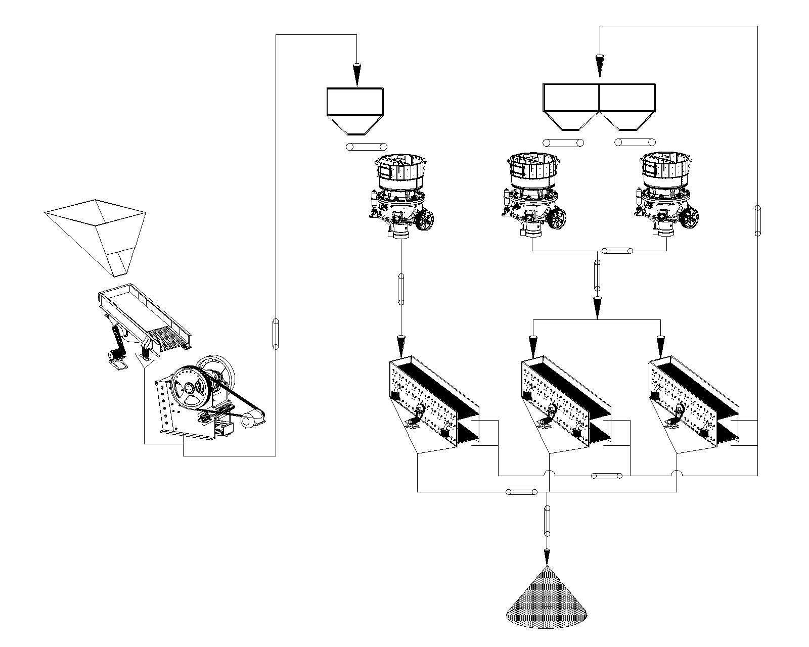 大塊的銅礦石經(jīng)料倉由振動給料機均勻地送進顎式破碎機或粗碎移動站(初破)進行粗碎;粗碎后的銅礦石經(jīng)過振動篩篩分后,由皮帶輸送機送到單缸液壓圓錐式破碎機(二破)進行中碎;中碎后的銅礦石物料送入多缸液壓圓錐式破碎機進行細(xì)碎;